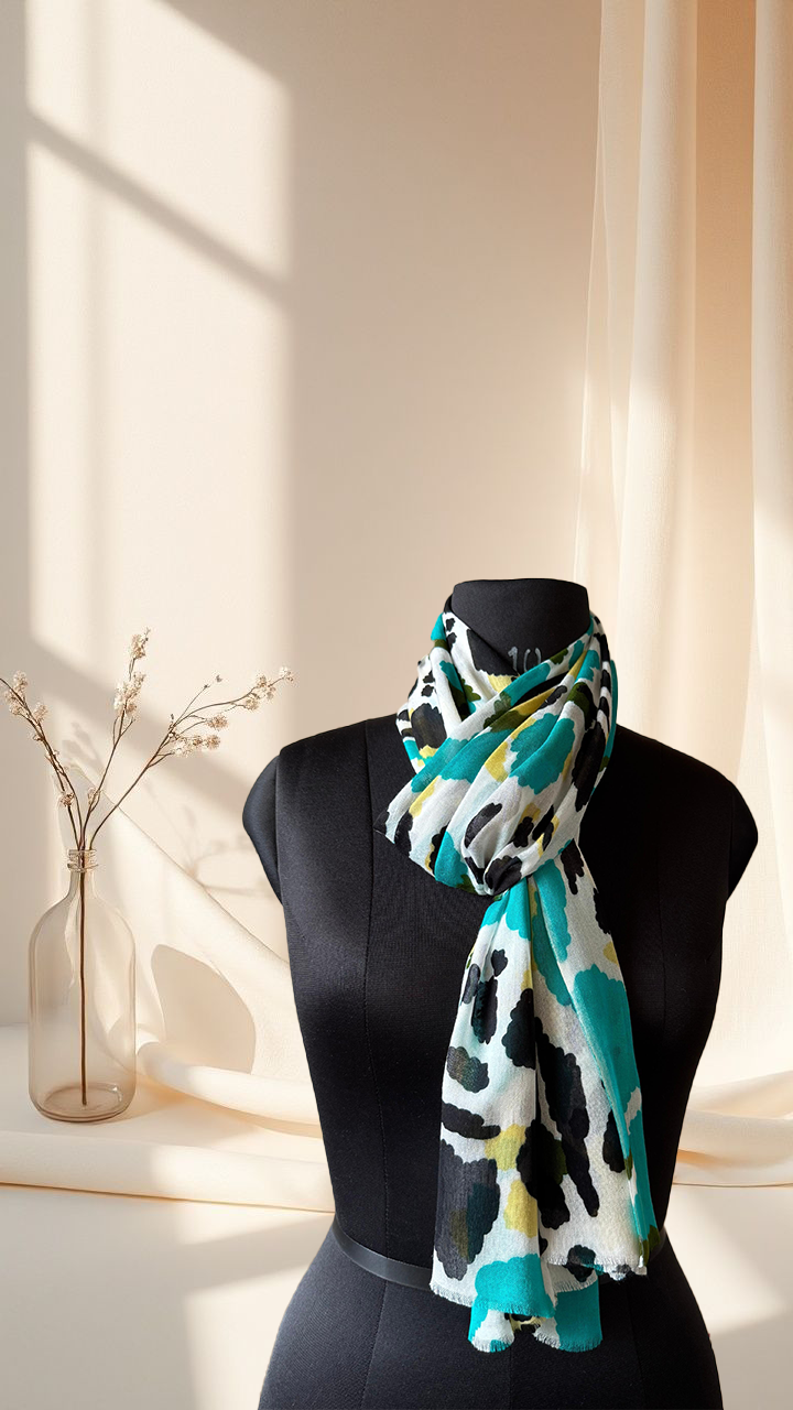 Bold and playful, this Noriza scarf features an abstract leopard-inspired print in teal, mustard, olive, and black on a soft ivory base. Its energetic pattern adds a vibrant, street-chic edge—perfect for those who love to make a statement.