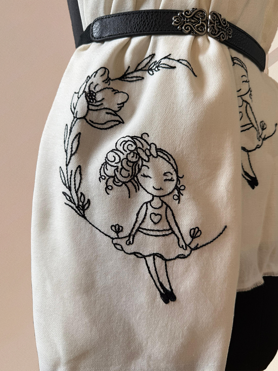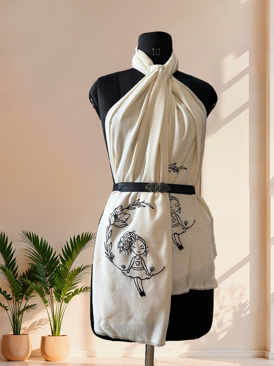 A unique and artsy piece, this scarf features monochrome embroidered illustrations of a girl in a whimsical pose. Lighthearted and expressive – it’s a wearable sketchbook.